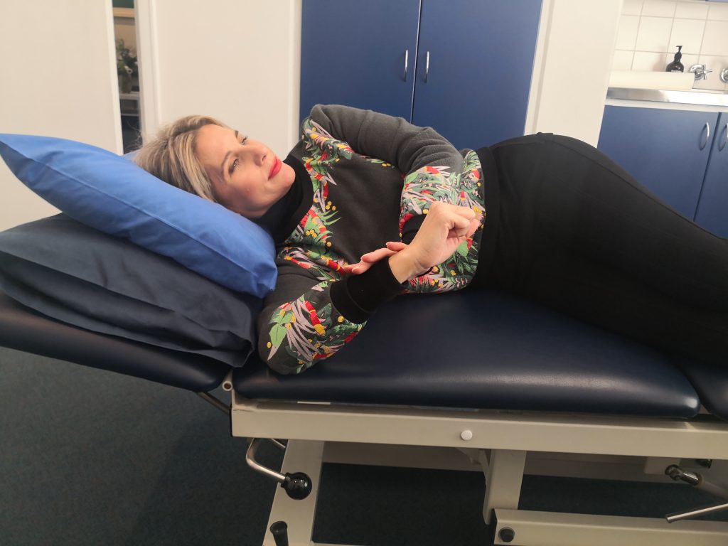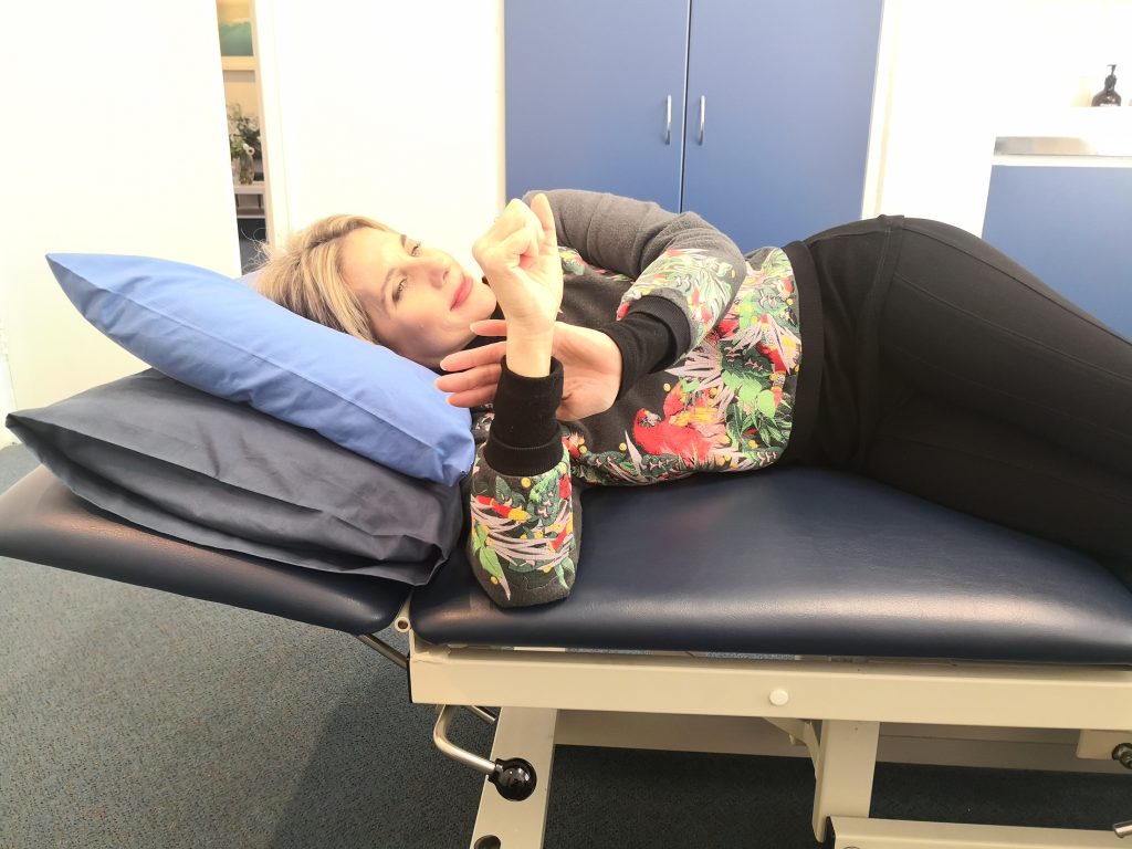 Lie on your side with your head well supported on a pillow. Raise you bottom arm up so that the elbow is in line with the shoulder (the elbow must remain at this level for the entire time). Place your palm down and place the top hand on the back of the wrist of the bottom arm. Keeping your elbow at shoulder height, gently press your forearm into the bed, eliciting a stretch through the back of the shoulder of the bottom arm. Hold for 20 seconds and repeat three times. If you feel pain in the front of the shoulder instead of the back, please cease the exercise.
