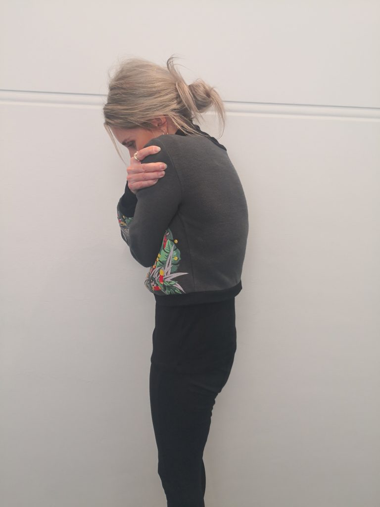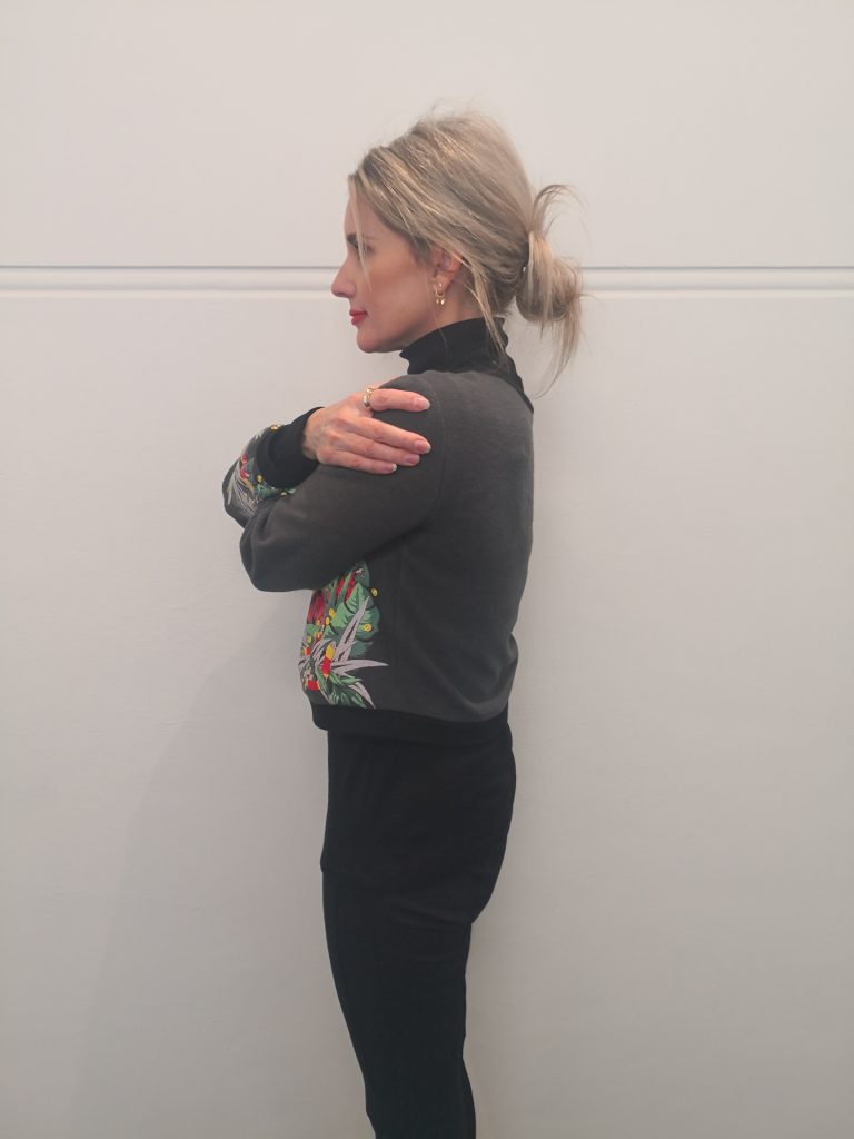 Sit or stand with your arms by your sides. Then interlock your elbows in front of you and place your arms across your body, grapsing onto the front of the opposite shoulder, whilst slumping forwards and rounding your shoulder and upper body forward until you feel a moderate stretch between your shoulder blades. Hold for 20 seconds and repeat three times.